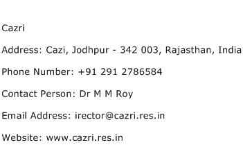 The address of Cazri is Cazi, Jodhpur - 342 003, Rajasthan, India.Contact Number of Cazri